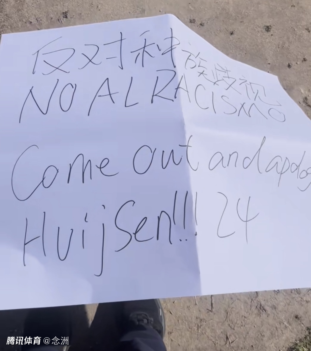 当地时间2月22日,有在西班牙的中国球迷举着牌子,来到皇马的训练基地门口进行抗议,牌子上写着“反对种族歧视,赫伊森出来道歉”!但是当天,赫伊森并没有出现,而且训练基地的门口保安明显增多了。