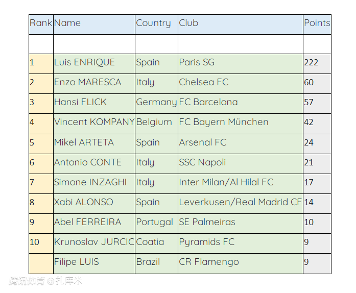 2025年,恩里克带领大巴黎连夺6个冠军,大巴黎也在恩里克的带领下展现出极强的统治力。恩里克在获得222分的评分,以绝对优势当选,排名第2的切尔西主帅马雷斯卡仅获得60分。