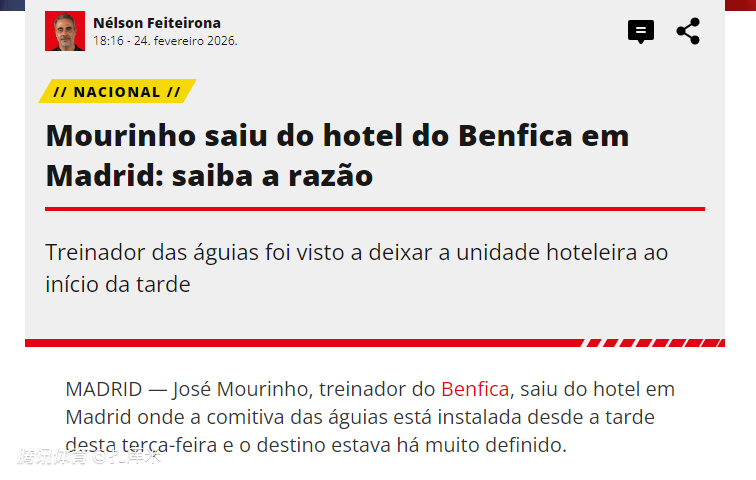 但周三,穆里尼奥突然离开球队下榻的酒店,前往西班牙马德里的一家医院,探望了一位挚友。虽然大战来临,但从穆里尼奥的行踪来看,本菲卡上下还是较为轻松。