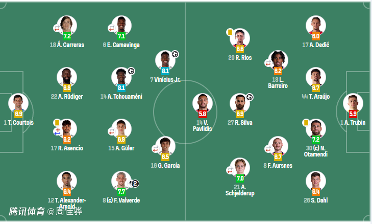 前锋:16-贡萨洛·加西亚(85’38-帕拉西奥斯)、7-维尼修斯