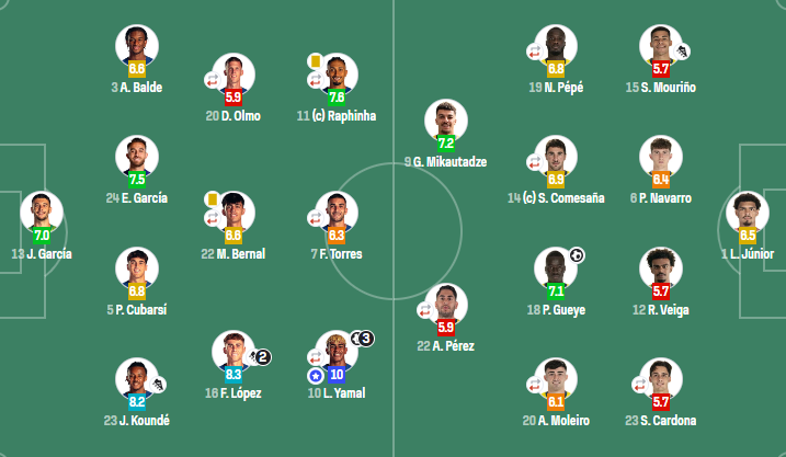 巴塞罗那:霍安-加西亚;孔德,库巴西,埃里克-加西亚,巴尔德;费尔明,贝尔纳尔(67'阿劳霍),奥尔莫(59'佩德里);亚马尔(73'巴德吉),费兰-托雷斯(67'莱万多夫斯基),拉菲尼亚(73'拉什福德)
