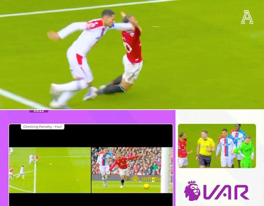 当时库尼亚接到布鲁诺·费尔南德斯的妙传,即将形成单刀面对门将,上半场进球的水晶宫后卫马克桑斯·拉克鲁瓦对他进行了拉拽。库尼亚倒在禁区内,裁判长时间分析VAR慢镜回放后,给出了「红点」套餐。赛后,这一判罚遭到水晶宫主帅奥利弗·格拉斯纳的猛烈抨击。