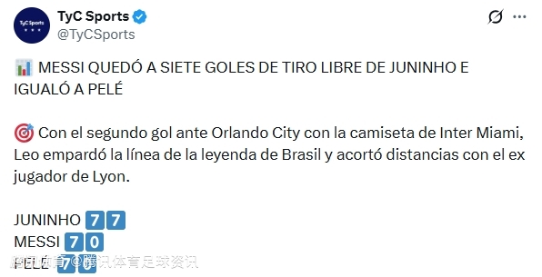 根据TYC体育的数据,梅西目前已打入70粒任意球,与贝利并列历史排名,距离榜首的儒尼尼奥仅差7球。