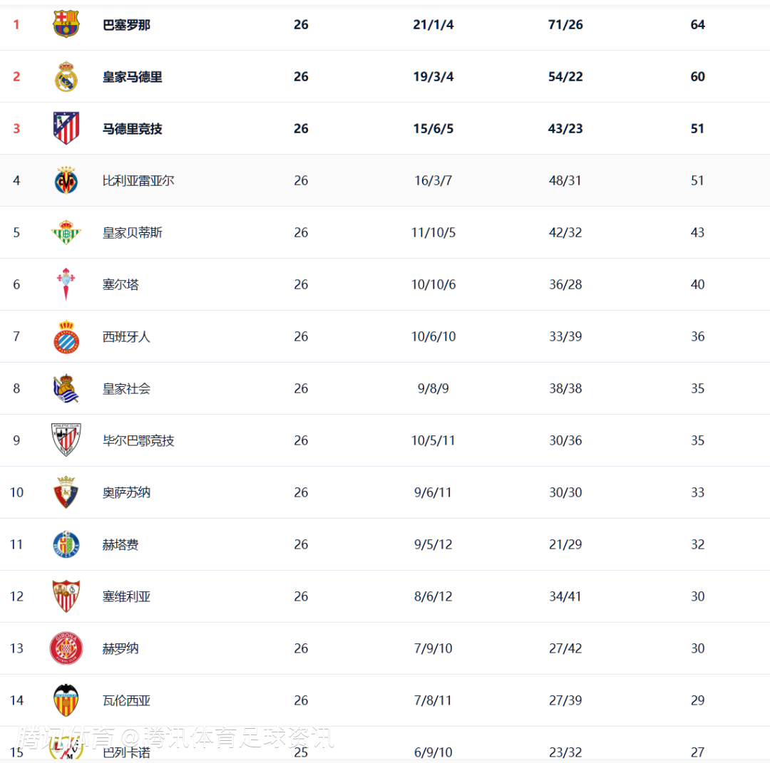 马竞与“黄潜”同积51分,分列第三和第四,欧冠席位之争依旧胶着。