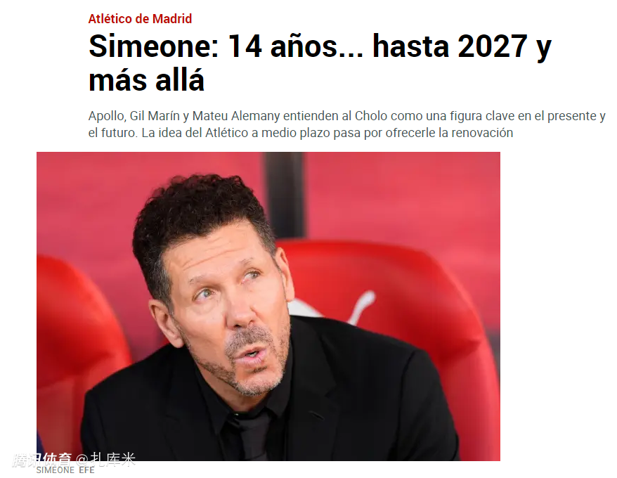 尽管目前尚未与西蒙尼展开正式谈判,但俱乐部高层已明确计划,计划第9次延长这位阿根廷名帅的合约。西蒙尼2年前签署的合同将在2027年到期,而高层希望将其续约。此事虽不急于一时,但意愿十分坚定。