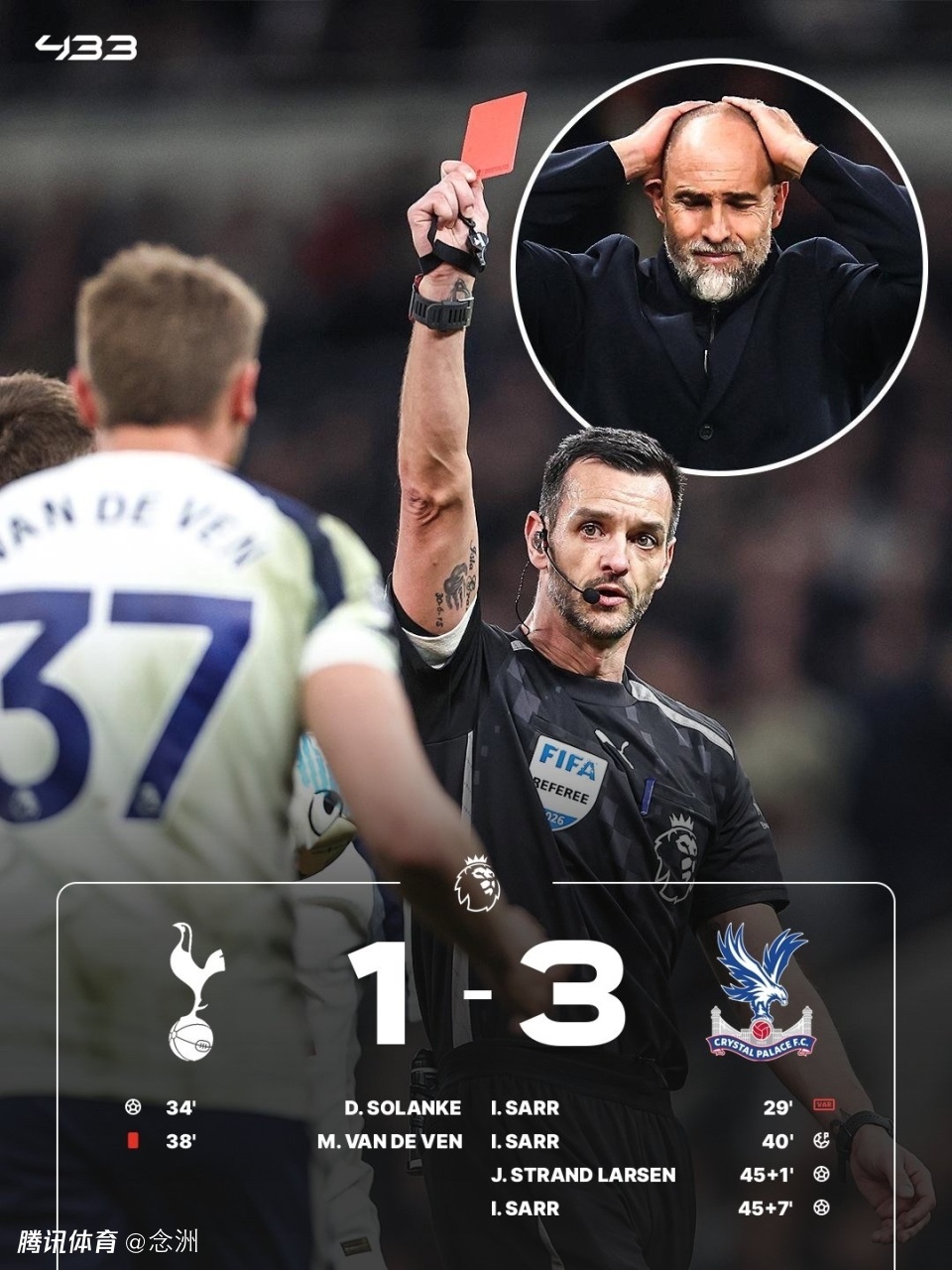 英超第29轮,热刺主场1-3负于水晶宫,5连败+11轮不胜,积29分仅领先降级区1分。萨尔进球被吹,索兰克建功,范德芬送红点,萨尔点射命中+双响,拉尔森破门,丹索头球攻门、索兰克小角度射门被扑。