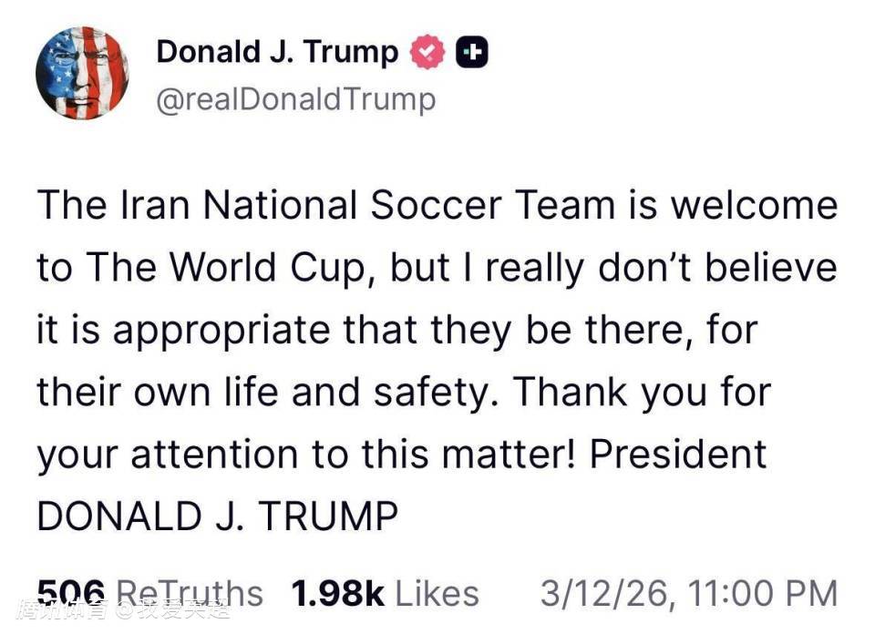 北京时间3月12日,在距离世界杯开幕仅剩90天时,美国总统特朗普在社媒发文,发表了自己对伊朗男足国家队参加美加墨世界杯的看法。
