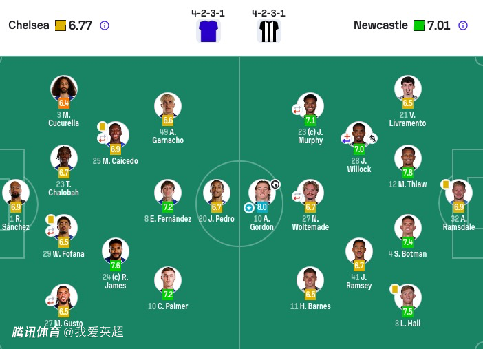 纽卡斯尔联首发:32-拉姆斯代尔、12-佳夫、4-博特曼、21-利夫拉门托、3-霍尔、28-威洛克、10-戈登