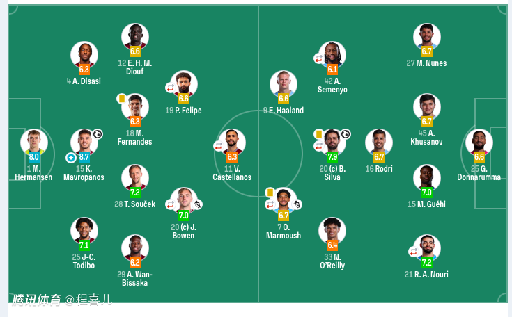 曼城首发:25-多纳鲁马、27-努内斯、45-胡桑诺夫、15-格伊、21-努里、9-哈兰德