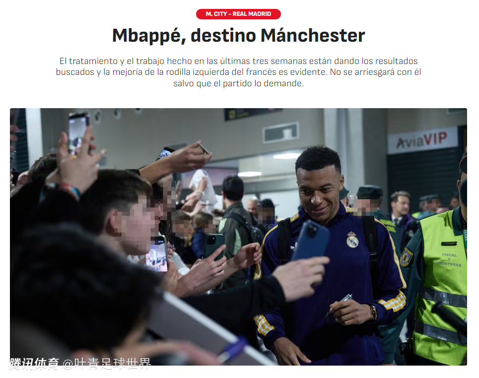 《阿斯报》指出,最近3周,姆巴佩的治疗与康复训练已初见成效,左膝的伤情改善显著。16日,皇马全队将乘坐飞机前往曼彻斯特,姆巴佩也将随队出行。法国巨星不是以看客的身份前往,希望与球队并肩作战。