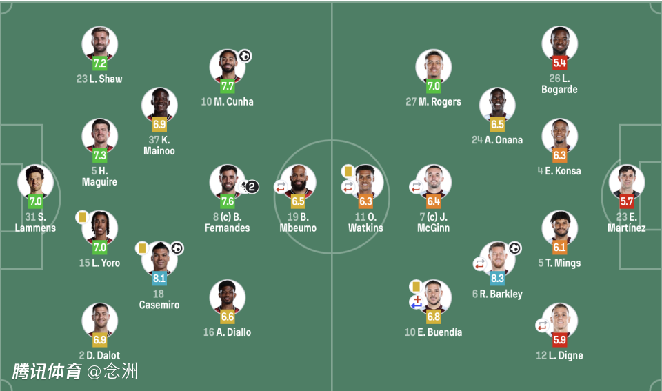 第64分钟,迪涅左路传中,巴克利禁区内顺势左脚兜射破门,VAR认定奥纳纳在越位位置并没有产生干扰,进球有效,1-1!维拉扳平。