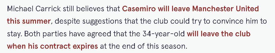 卡里克在赛后承认,卡塞米罗的状态使他成为当前球队不可或缺的一员。只是虽然有传言称曼联可能会试图挽留卡塞米罗,卡里克仍然认为巴西中场今夏会离开,他在合同期满后自由转会,已经通过俱乐部进行了官宣。