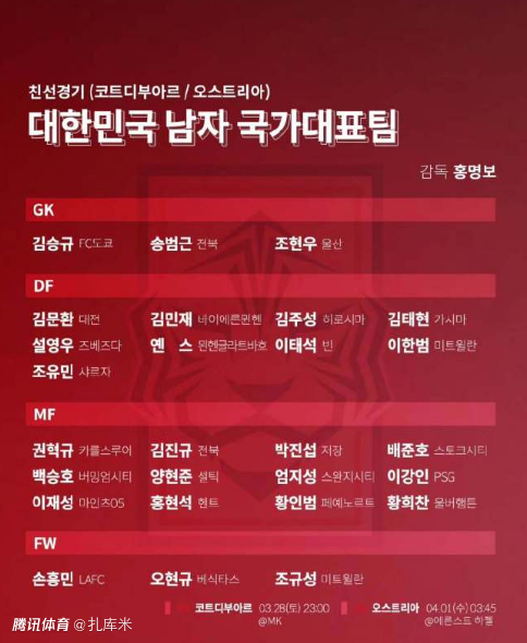 3月28日和4月1日,韩国队将分别在米尔顿凯恩斯和维也纳迎战科特迪瓦队和奥地利队。这也是世界杯之前,最后一次国际比赛日,韩国队将迎来2场难得的检验队伍机会,这2场比赛之后,世界杯大名单基本确定。