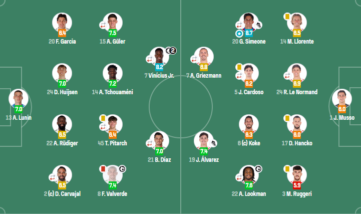 皇家马德里:卢宁;卡瓦哈尔(63'亚历山大-阿诺德),吕迪格,赫伊森,弗兰-加西亚;巴尔韦德,皮塔奇(63'姆巴佩),琼阿梅尼,居莱尔(74'贝林厄姆);布拉欣-迪亚斯(74'卡马文加),维尼修斯(87'卡雷拉斯)