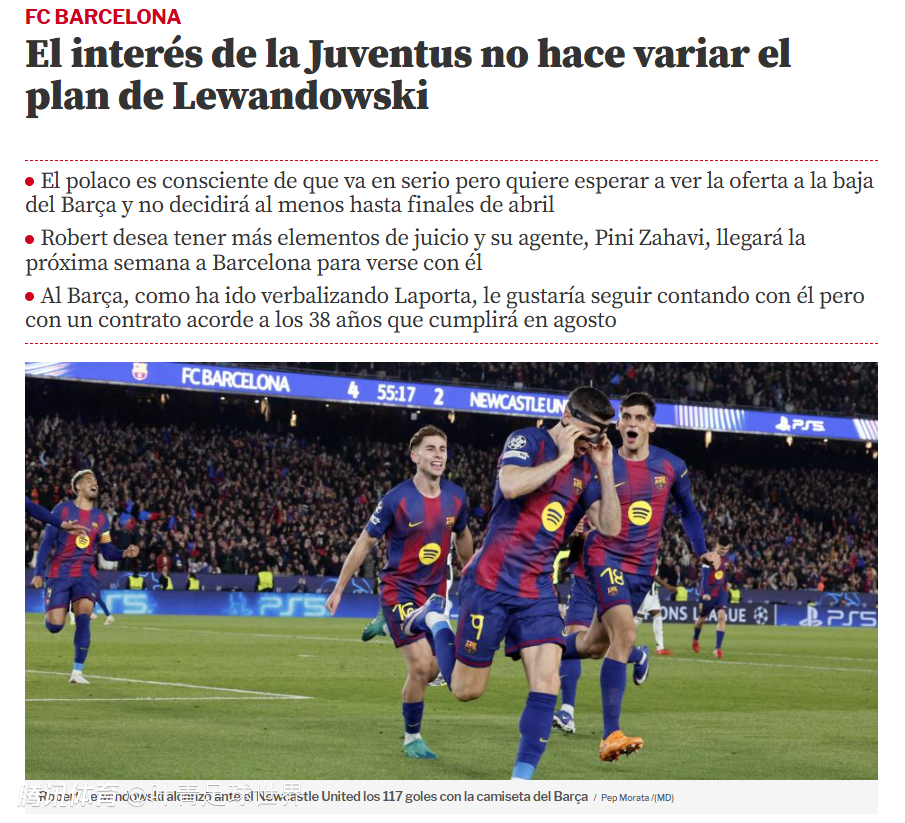 《世界体育报》称,莱万并不急于做决定。眼下,莱万最重要的目标是带领波兰杀进世界杯;4月份,巴萨与马竞大战3场,这关系到巴萨在欧冠、西甲的争冠局势。莱万也清楚,巴萨正在规划2026-27赛季,他将在4月底给出答案,到底是接受降薪续约巴萨,还是去尤文踢球。