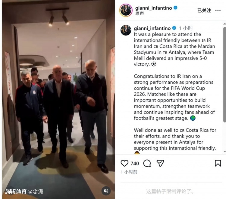赛后,因凡蒂诺发文道:“很高兴在土耳其安塔利亚的马尔丹体育场现场观看伊朗与哥斯达黎加的国际友谊赛。伊朗国家队表现出色,以5-0大胜对手。祝贺伊朗队奉献了一场精彩的比赛!随着2026年世界杯备战的持续推进,此类赛事是积累势头、强化团队协作并在足球最高舞台到来之前持续激励球迷的重要机会。”