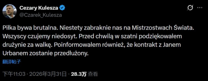 不过对于波兰主帅的带队表现,足协主席还是给与了肯定。波兰足协主席在社媒写道:“足球有时是残酷的。遗憾的是,我们将缺席本届世界杯。”