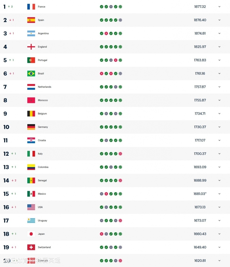 世界杯卫冕冠军阿根廷男足则稳居第3位。英格兰排名第4位,葡萄牙超越巴西上升至第5位。第7至第10名分别是荷兰、摩洛哥、比利时和德国。