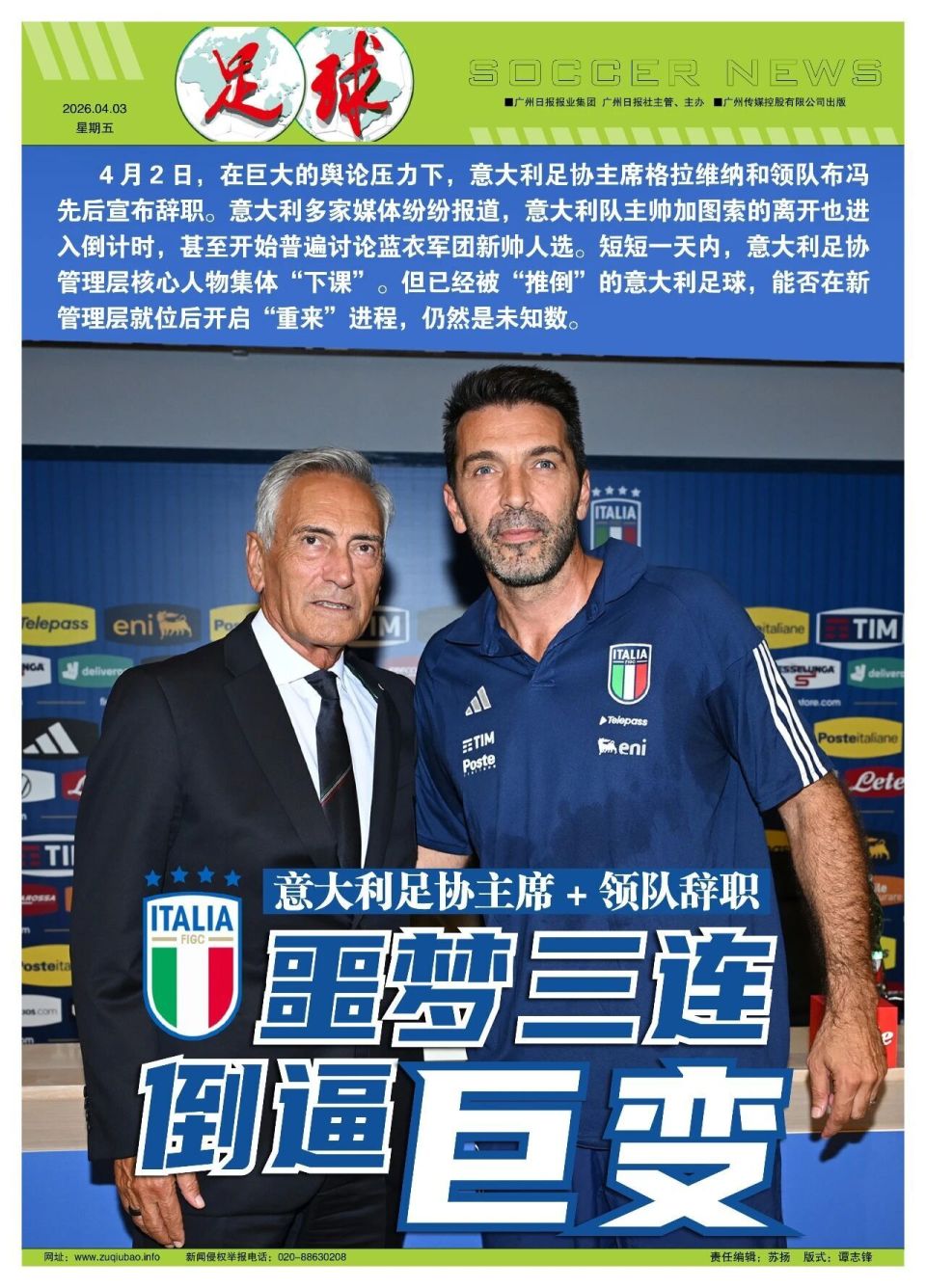 撰稿/寒冰 连续3次无缘世界杯,终于迫使意大利足坛发生最激烈的巨变。4月2日,在巨大的舆论压力下,意大利足协主席格拉维纳和领队布冯先后宣布辞职。意大利多家媒体纷纷报道,意大利队主帅加图索的离开也进入倒计时,甚至开始普遍讨论蓝衣军团新帅人选。短短一天内,意大利足协管理层核心人物集体“下课”。但已经被“推倒”的意大利足球,能否在新管理层就位后开启“重来”进程,仍然是未知数。