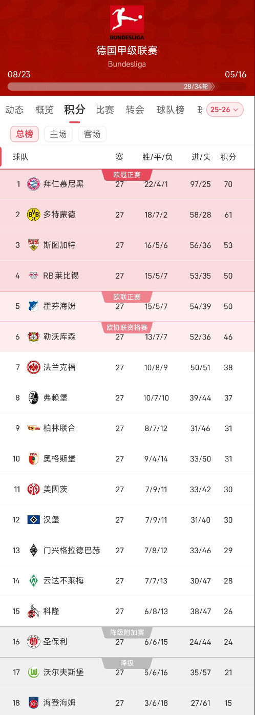 沃尔夫斯堡则在积分榜排名倒数第二,距“保级线”分差5分,想要避免降级,必须力拼每一场比赛。同时,德国天空台指出,目前德甲第9到第18名都存在降级风险,如此规模的保级乱战,也就意味着沃尔夫斯堡仍有希望。总之,两队都战意十足。