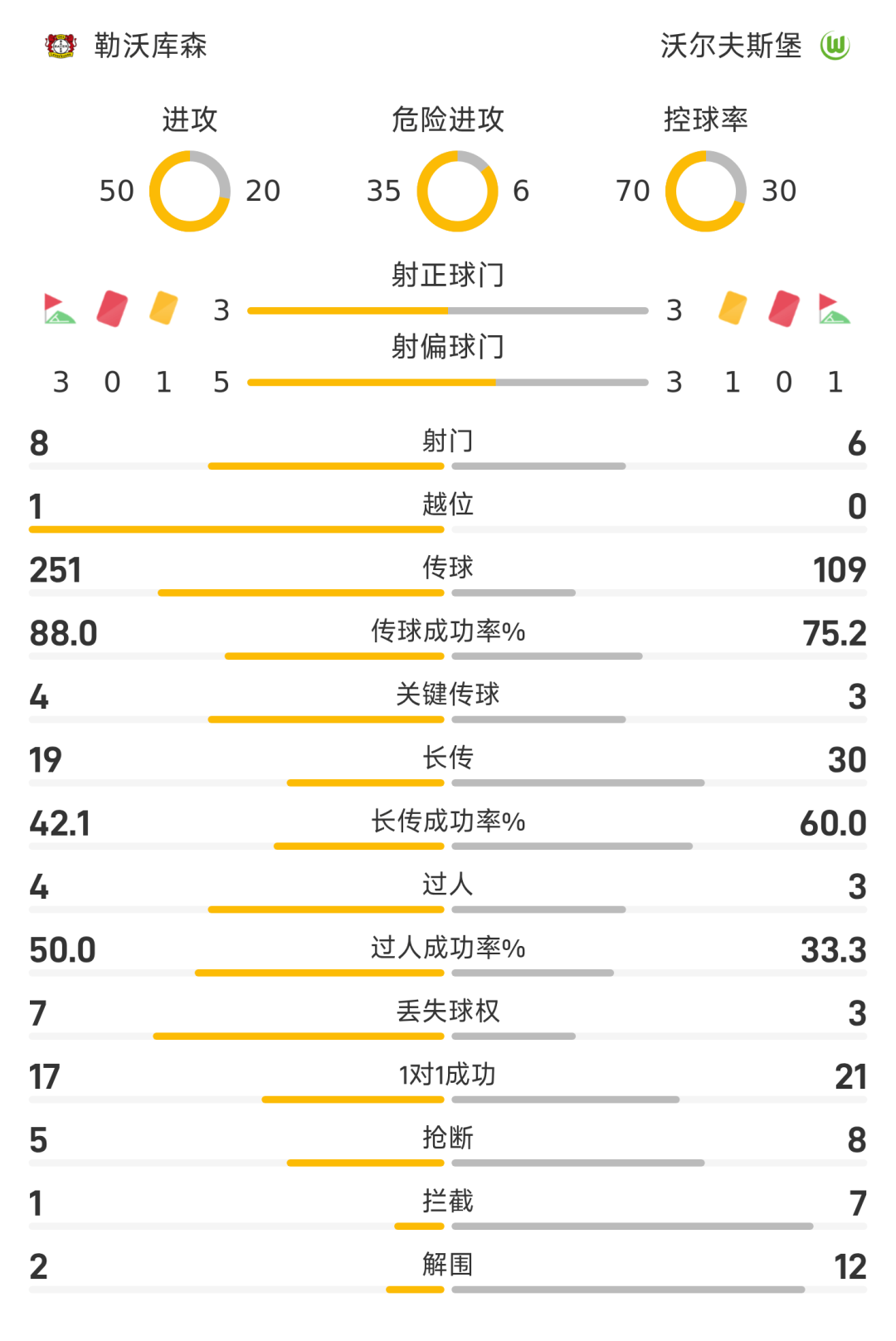 沃尔夫斯堡首发阵容:1-格拉巴拉、3-瓦夫罗、4-库利埃拉基斯、6-贝洛西安、24-埃里克森、21-梅勒、5-索萨、39-威默、9-阿莫拉、26-库姆贝迪、23-温德