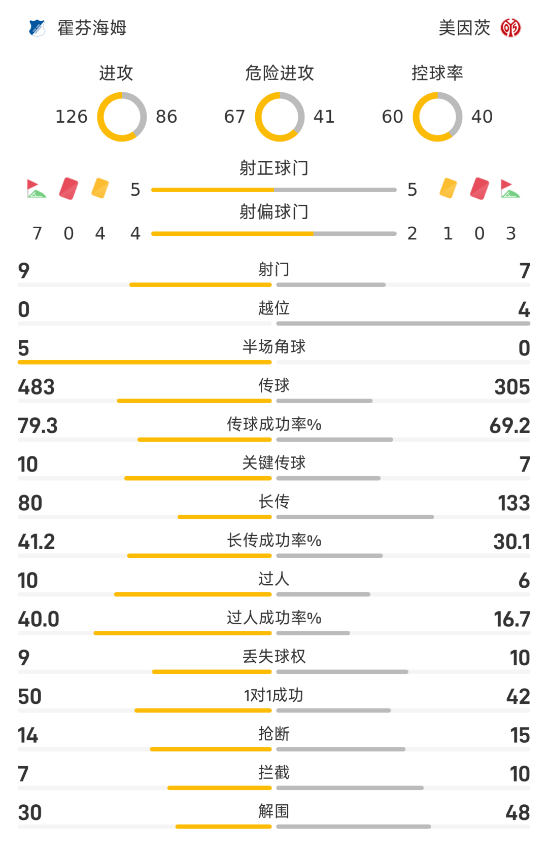 霍芬海姆首发阵容:1-鲍曼、34-曹法尔(61’7-阿夫杜拉胡)、13-贝尔纳多、5-卡巴克、21-哈吉达里、6-普罗梅尔、18-伯格、22-普拉斯(84’9-贝博)、11-阿斯拉尼(61’27-克拉马里奇)、19-伦珀尔(87’33-莫尔斯特德)、29-图雷