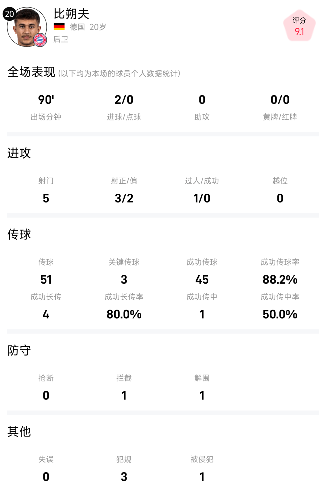 本场比赛,拜仁慕尼黑球员比朔夫首发出场90分钟,贡献2进球、5次射门3次射正、1次过人、传球51次45次成功(传球成功率88.24%)、1次拦截、1次封堵、1次封堵,媒体评分9.1分。