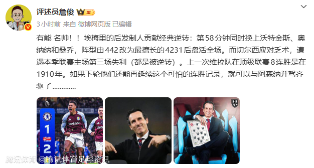詹俊:“有能 名帅!!埃梅里的后发制人贡献经典逆转:第58分钟同时换上沃特金斯、奥纳纳和桑乔,阵型由442改为最擅长的4231后盘活全场。而切尔西应对乏术,遭遇本季联赛主场第三场失利(都是被逆转)。上一次维拉队在顶级联赛8连胜是在宣统二年---1910年。如果下轮他们还能再延续这个可怕的连胜记录,就可以与阿森纳并驾齐驱了.............”