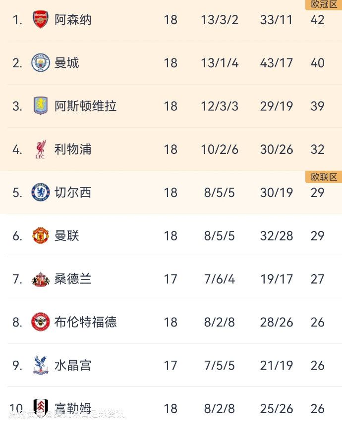 北京时间12月28日,英超18轮结束了大部分比赛,排名前三的阿森纳、曼城以及维拉均是笑到了最后,积分榜排名也暂无变化。