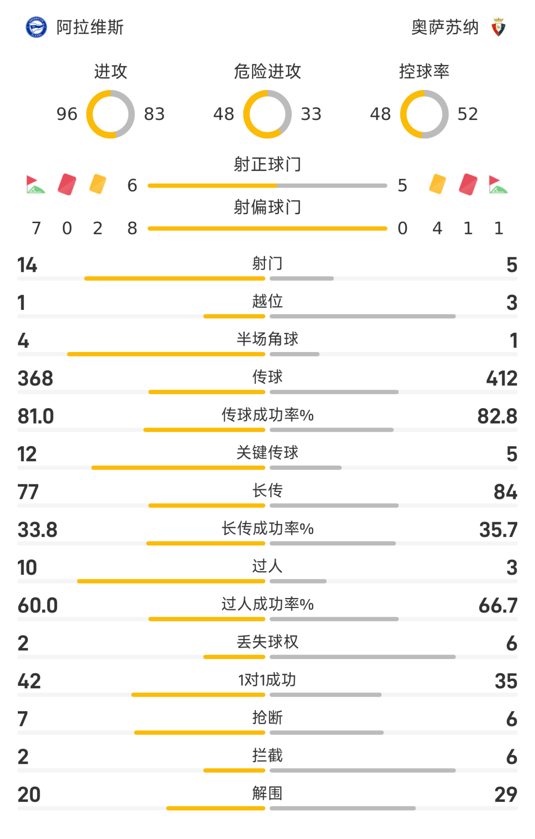 25/26赛季西甲联赛第30轮,上半场罗齐尔闪击,半场结束前马丁内斯破门扳平比分。下半场穆尼奥斯造点,布迪米尔点射将比分超出,随后马丁内斯造点,博耶点射绝平,奥桑贝达在替补席上对裁判不满染红,最终阿拉维斯2-2战平奥萨苏纳。