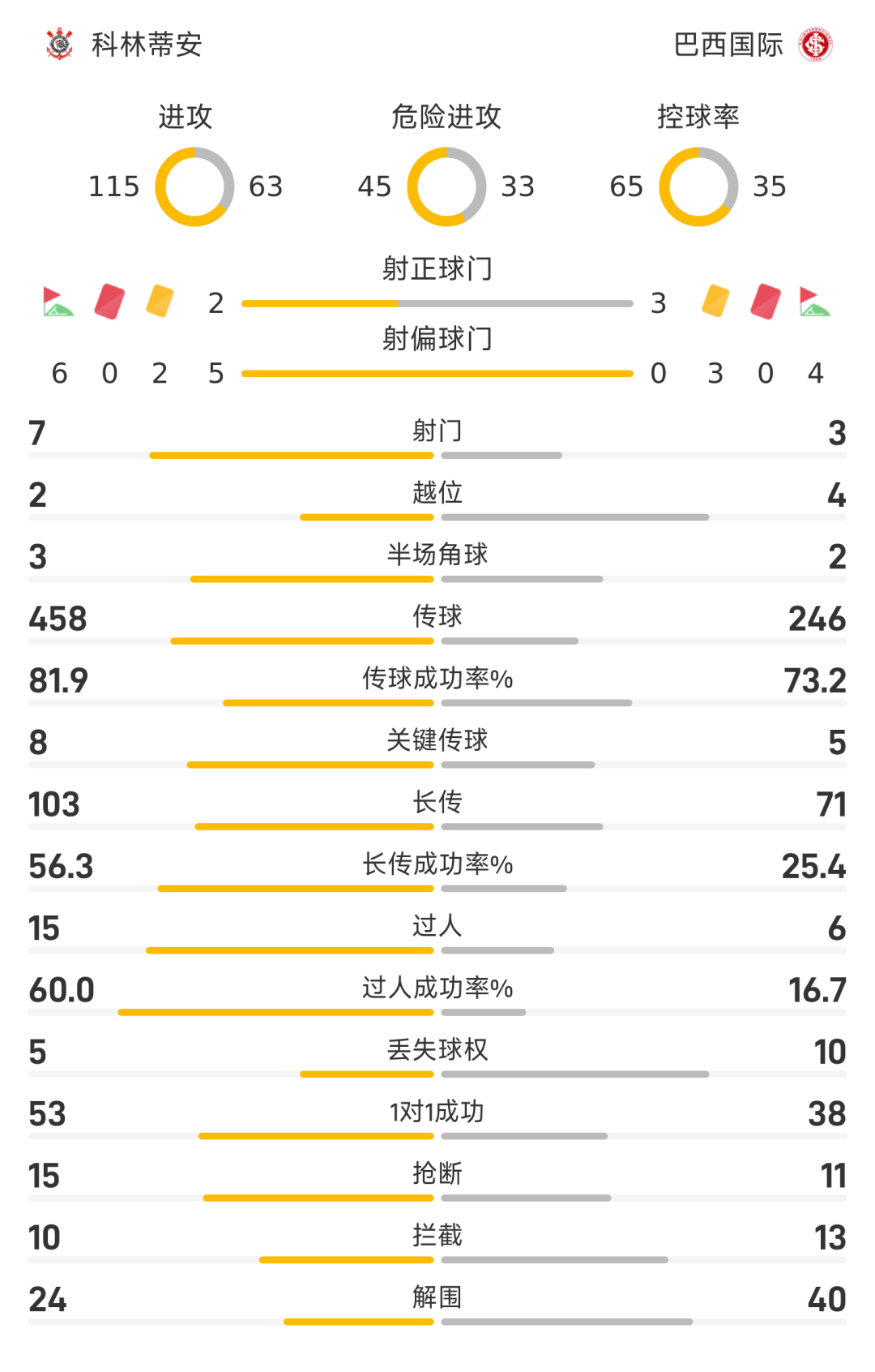 科林蒂安首发阵容:1-索萨、5-拉马略、13-恩里克、26-安吉莱利、2-马特乌西尼奥(88’61-迪亚吉尼奥)、23-佩雷拉(46’8-加罗)、14-拉尼尔(83’18-劳尔)、7-比东(72’52-拉布亚德)、49-安德烈、77-林加德(72’11-维蒂尼奥)、9-阿尔贝托