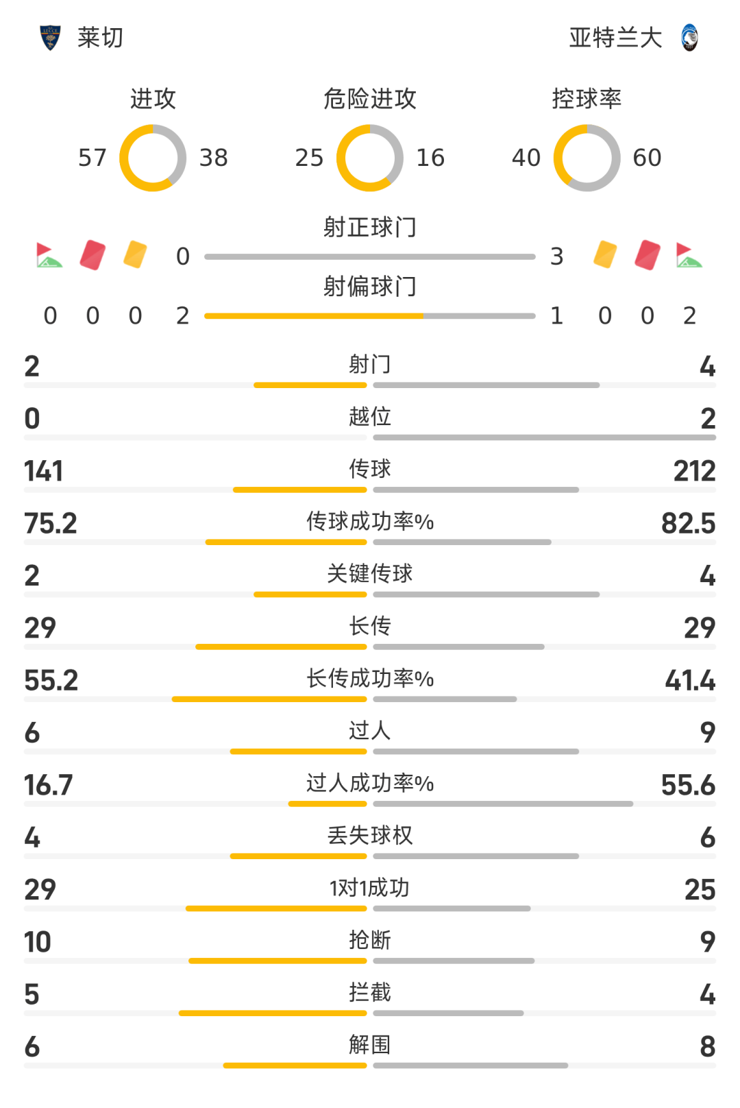 29’斯卡尔维尼禁区内大力抽射建功,亚特兰大1-0莱切
