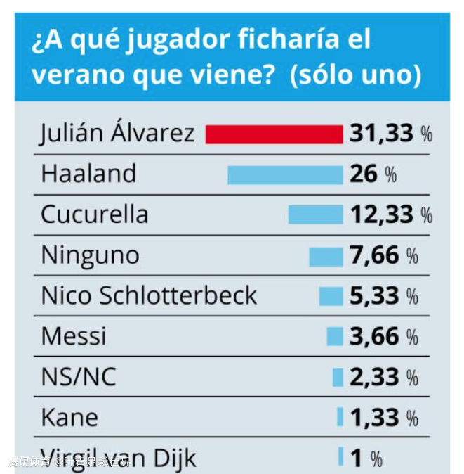 曼城的哈兰德,以26%的得票率成为巴萨会员第2想要引进的球员。当然,这只是梦想,不切实际。巴萨没有绝对的经济实力引进哈兰德,曼城也不会出售当家中锋。