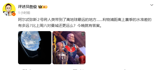詹俊写道:“阿尔忒弥斯2号将人类带到了离地球最远的地方……利物浦距离上赛季的水准差的有多远?比上周六对曼城还更远么?今晚就有答案。”
