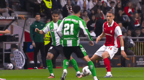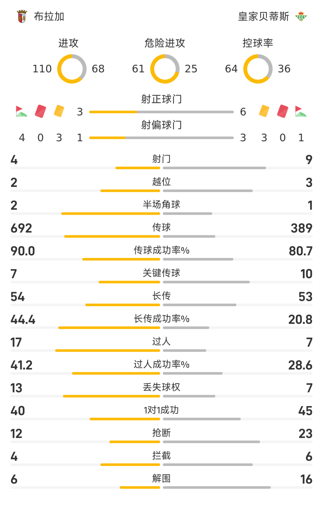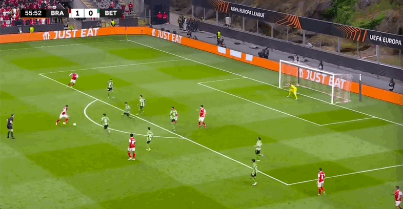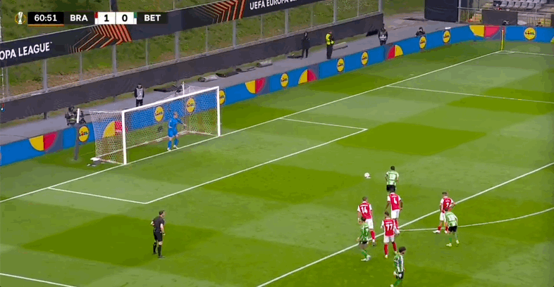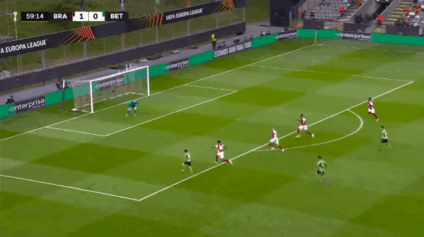 61’戈尔比禁区飞铲送点,埃尔南德斯主罚命中,布拉加1-1贝蒂斯