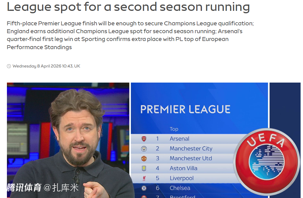 在英超提前锁定下赛季欧冠的第5个名额后,英国媒体对英超下赛季的欧战名额前景进行了分析,极端情况下,英超下赛季最多有7支球队可以进入欧冠,利物浦和维拉成为完成壮举的关键。