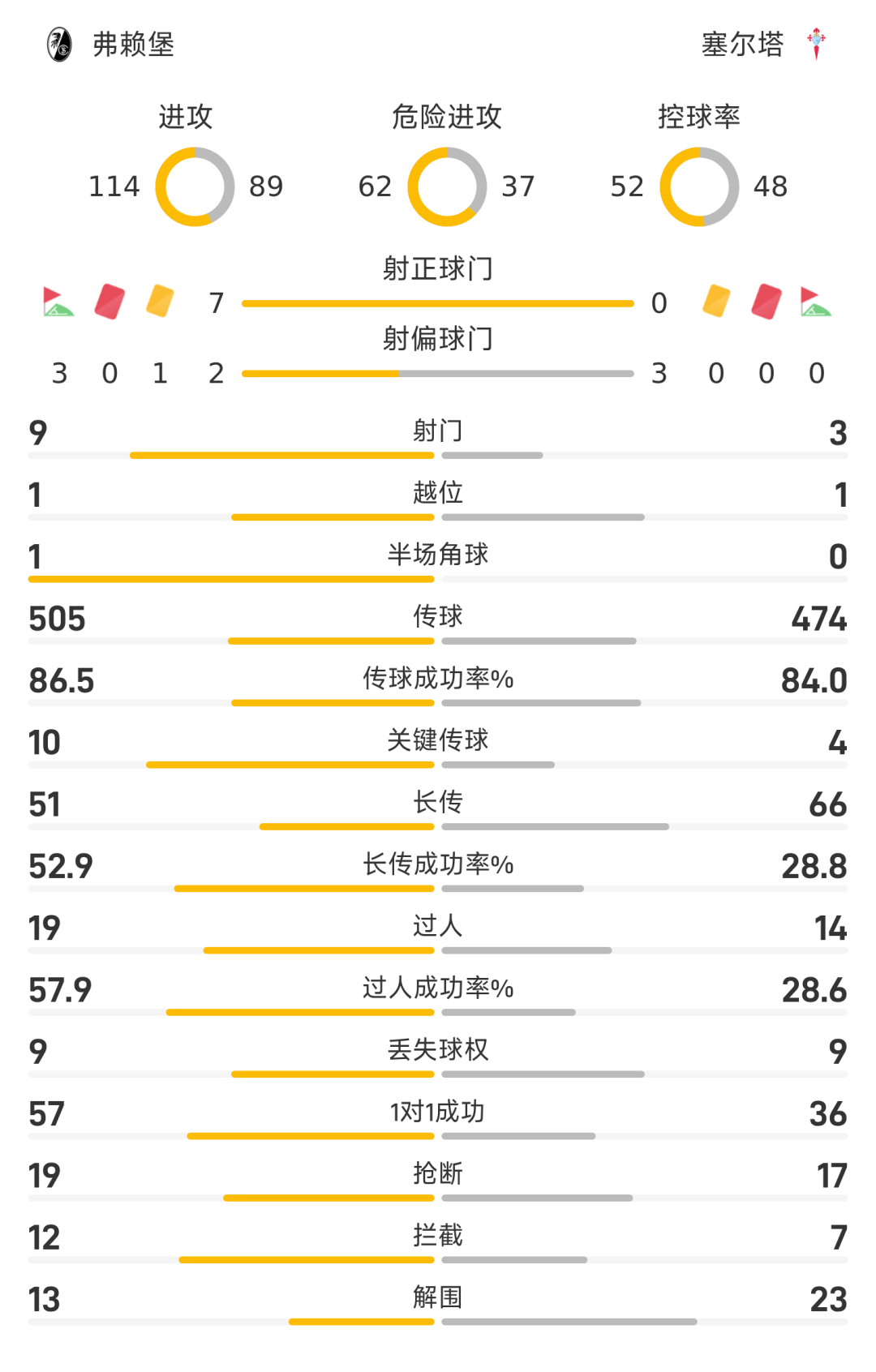 塞尔塔首发阵容:13-拉杜、20-阿隆索、4-艾杜、32-加利亚诺(46’30-洛佩斯)、3-明格萨、5-卡雷拉、6-莫里巴、22-索特罗(61’15-贝西诺)、7-伊格莱西亚斯(73’10-阿斯帕斯)、9-尤特格拉(73’18-杜兰)、19-斯威德伯格(46’39-阿卜杜拉乌伊)