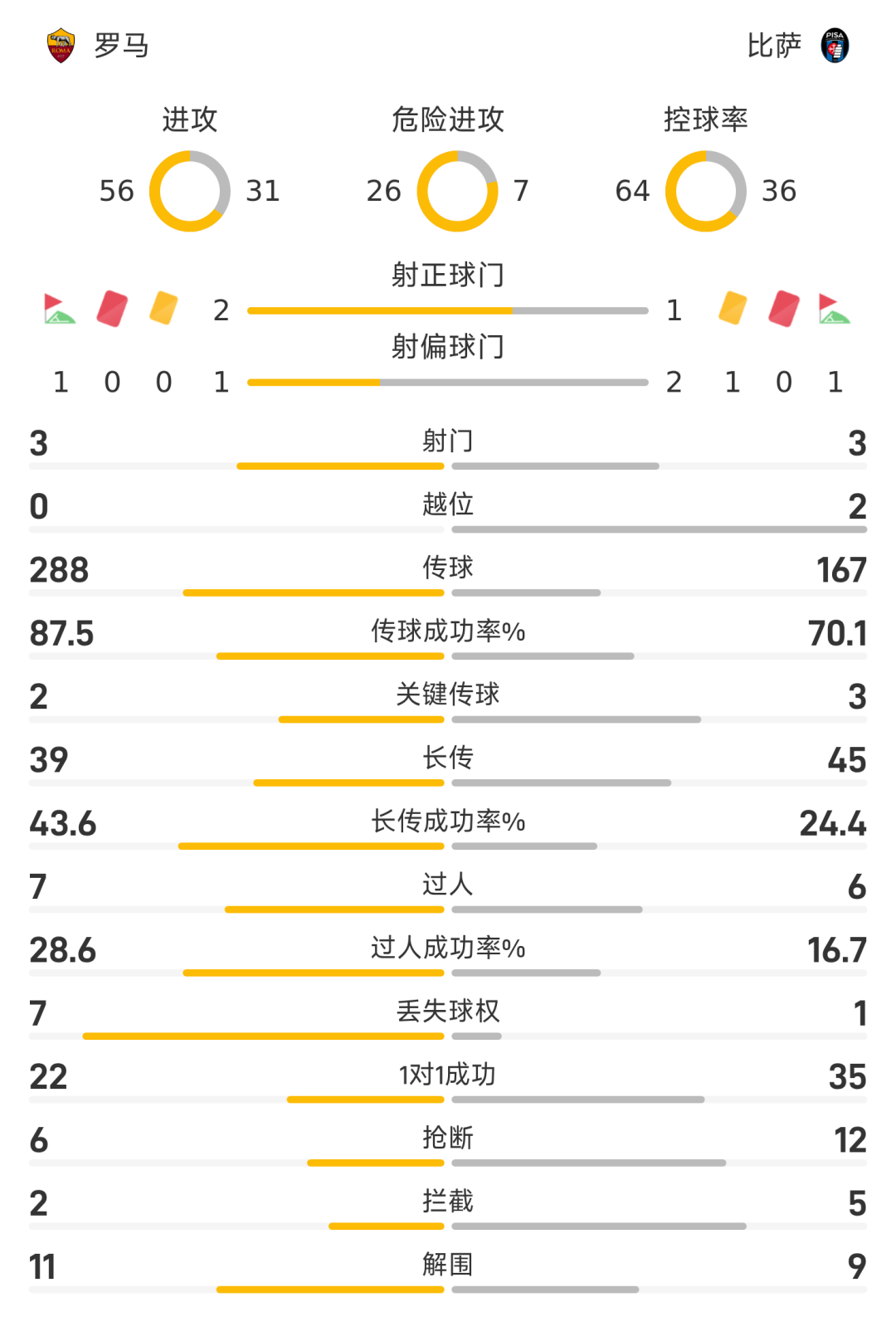 罗马首发阵容:99-斯维拉尔、22-埃尔莫索、5-恩迪卡、87-吉拉迪、4-克里斯坦特、7-佩莱格里尼、19-切利克、2-伦施、18-苏莱、61-皮西利、14-马伦