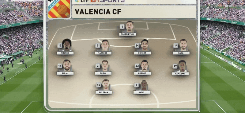 瓦伦西亚首发阵容:1-迪米特列夫斯基、14-加亚(75’21-巴斯克斯)、24-科默特(75’18-佩佩卢)、12-科雷亚、5-塔雷加、2-罗德里格斯、23-乌格里尼奇、11-里奥哈(60’16-洛佩斯)、17-拉马扎尼、6-萨迪克(61’9-杜罗)、15-贝尔特兰(81’7-丹朱玛)