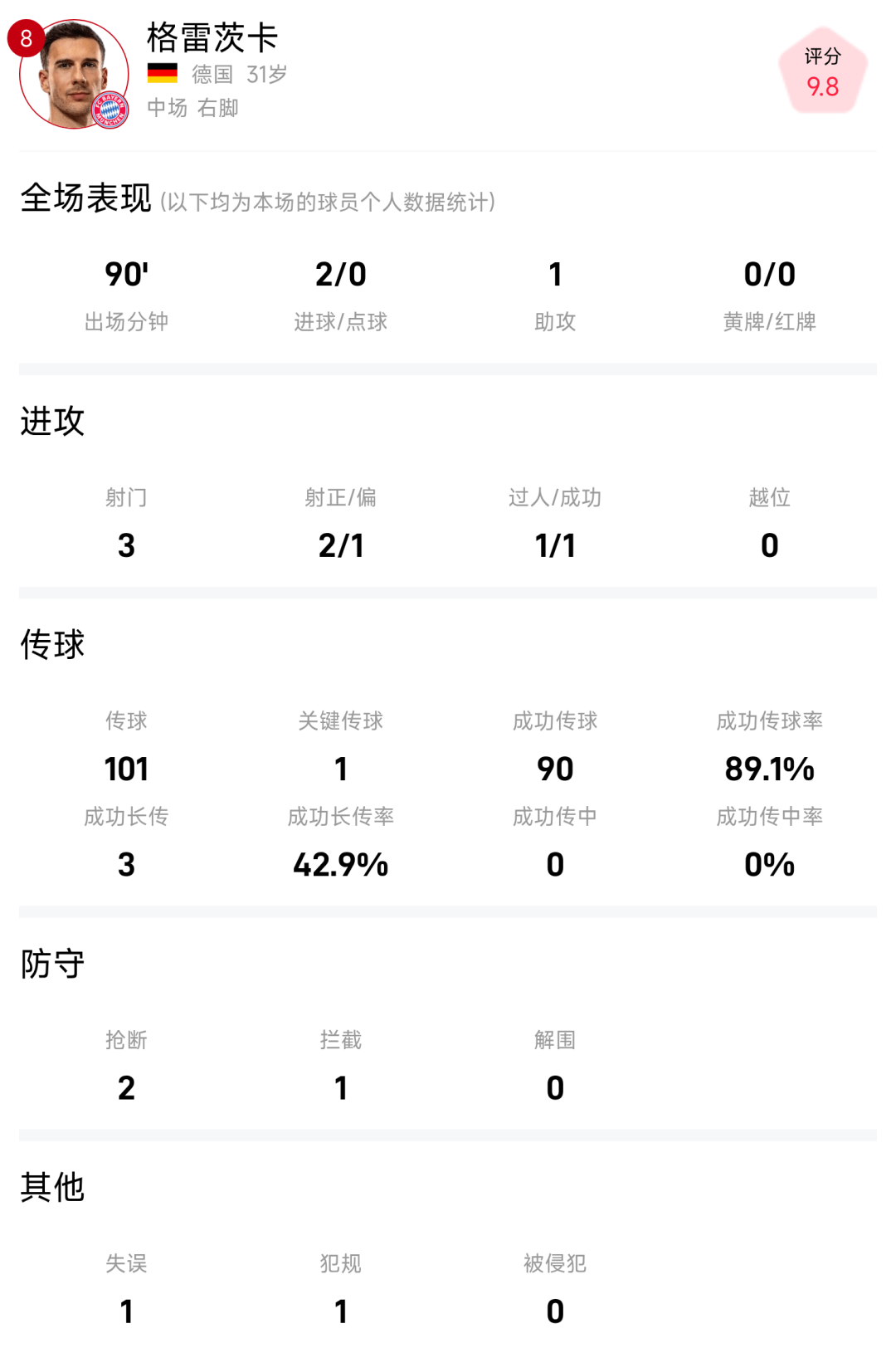 德甲联赛,拜仁慕尼黑5-0战胜圣保利。本场比赛,拜仁慕尼黑球员格雷茨卡首发出场90分钟,贡献2进球、1助攻、3次射门2次射正、1次过人1次成功、传球101次90次成功(传球成功率89.11%)、2次抢断、1次拦截、1次封堵,媒体评分9.8分。