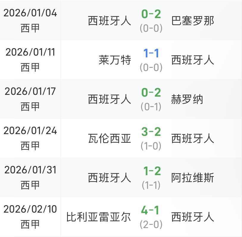 据统计,西班牙人从2026年之后未尝胜绩,已经连续14场不胜。
