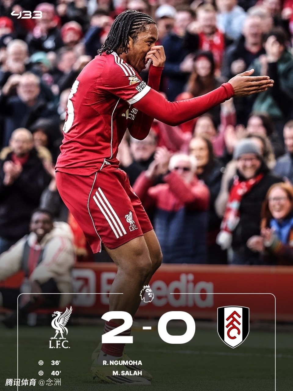利物浦主场2-0击败富勒姆,终结各项赛事3连败,先赛领先身后的切尔西4分。恩古莫哈右脚精彩兜射破门,加克波助攻萨拉赫再下一城,柯蒂斯-琼斯内收肌受伤无奈伤退。