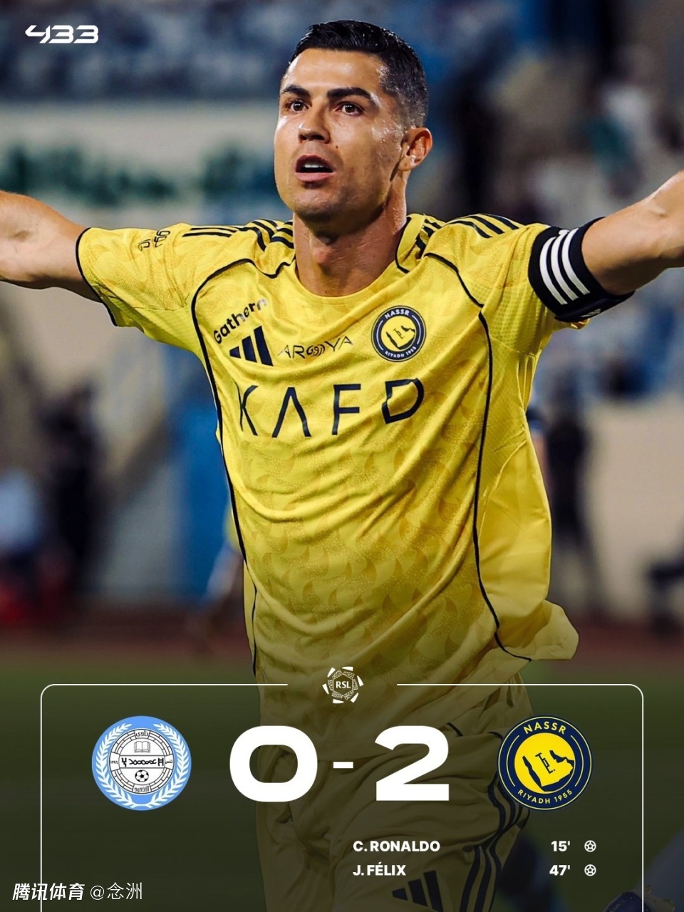 沙特联第28轮,利雅得胜利客场2-0战胜阿科多,豪取联赛14连胜,积73分继续领跑,领先第2名新月5分。C罗连场破门+生涯第968球,菲利克斯补射扩大比分。