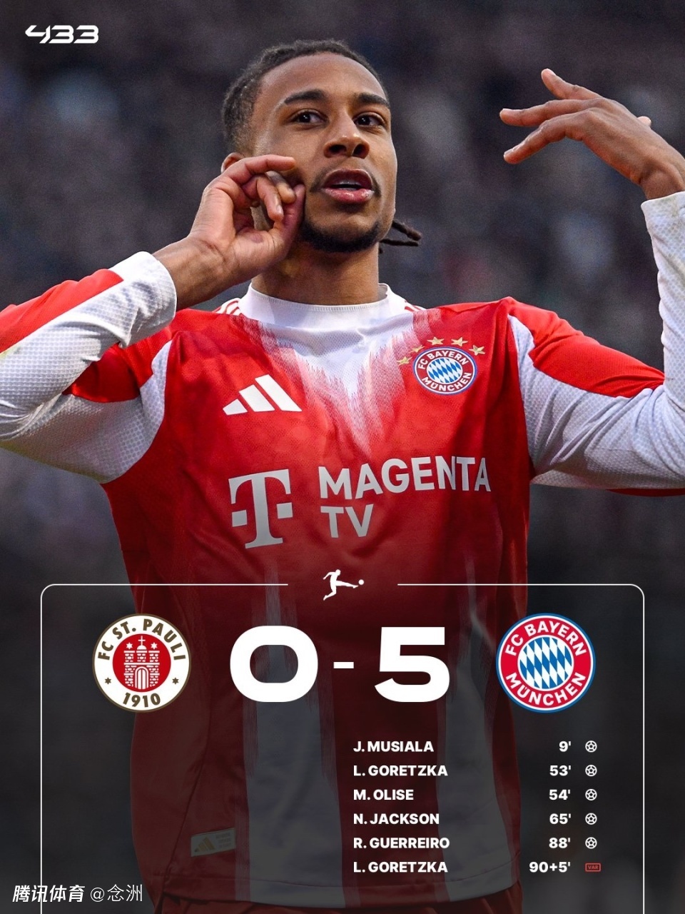 德甲第29轮,拜仁客场5-0圣保利,本赛季打进105球,打破队史联赛单赛季进球纪录,各项赛事五连胜,12分优势领跑积分榜,若下轮自己取胜而多特丢分,则提前夺冠。穆西亚拉头球破门,格雷茨卡、奥利塞再下一城,杰克逊建功,格雷罗锁定胜局。