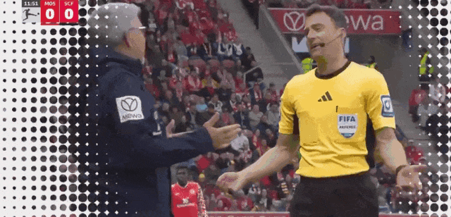 12’美因茨主帅费希尔不解裁判判罚,主裁判兹瓦耶尔到场边与其聊天