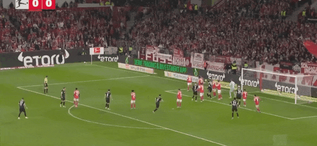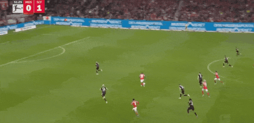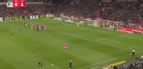 47’弗赖堡界外球进攻,赫勒头球吊射破门,美因茨0-1落后