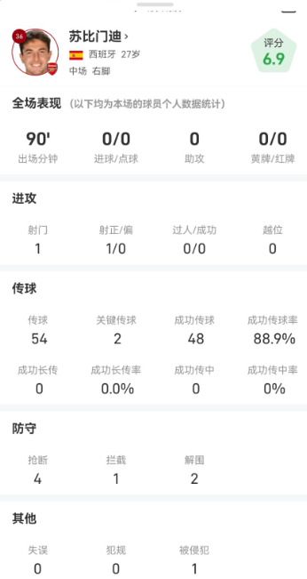 这场比赛里,他在场上有着1次射门,并且成功射正,有着54次传球,其中48次成功,包括2次关键传球,传球成功率高达88.9%。在防守端,苏比门迪有着4次抢断,1次拦截和2次解围。