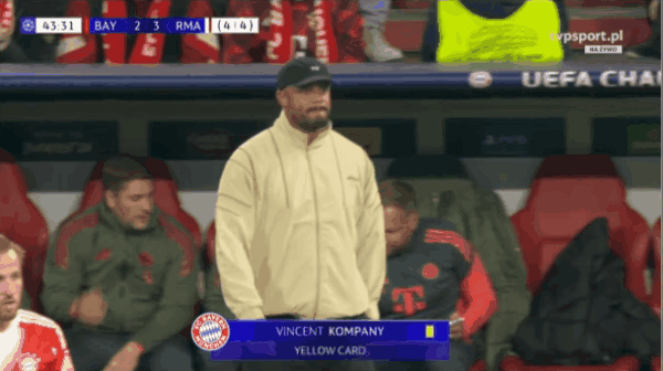在比赛第42分钟姆巴佩为皇马打进第三粒进球前,吕迪格在防守斯坦尼西奇时有疑似冲撞犯规动作。拜仁主帅孔帕尼为此向裁判抱怨而吃到本赛季第三张黄牌,在下一场与巴黎的欧冠半决赛首回合将停赛。