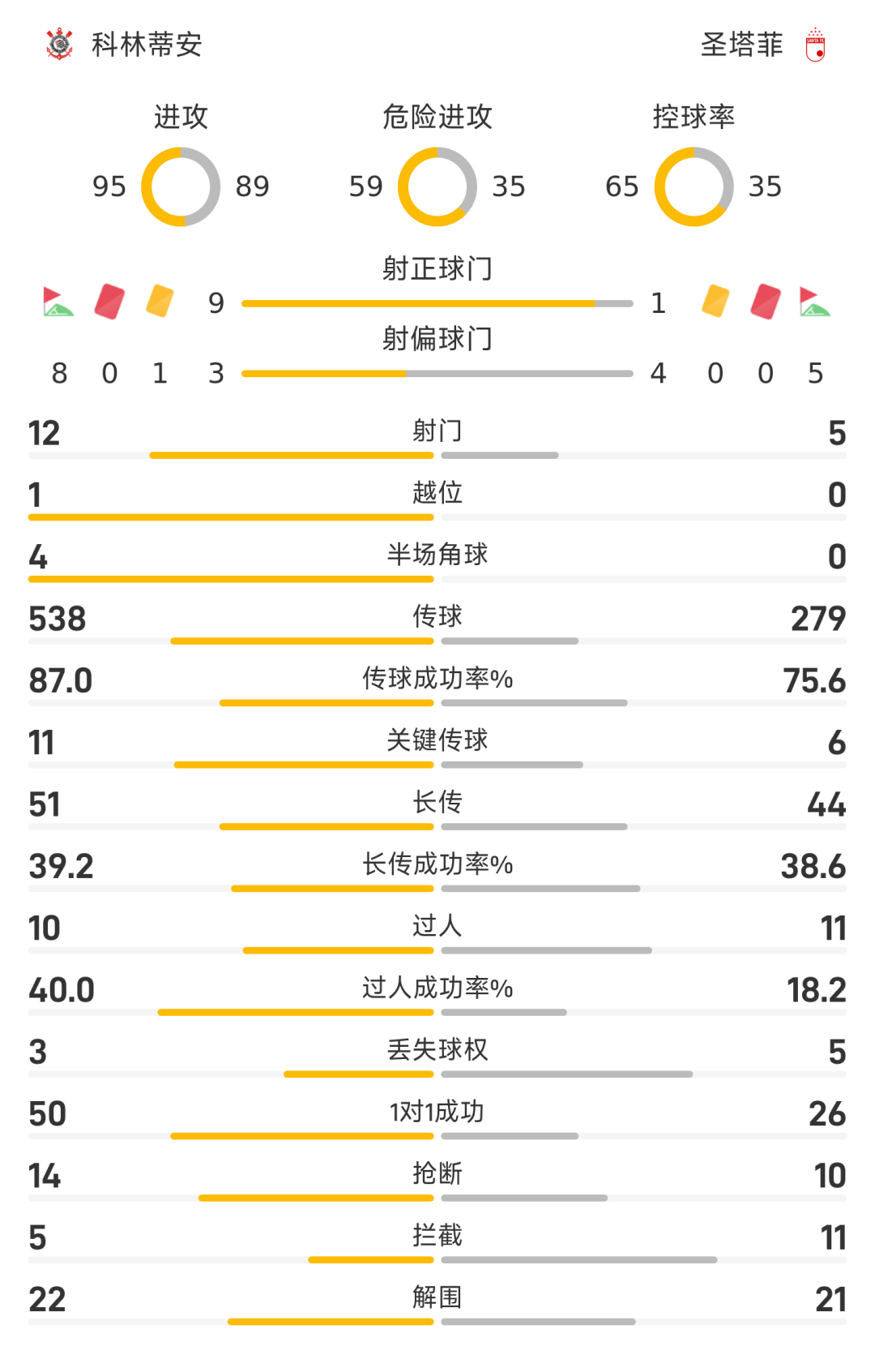 科林蒂安首发阵容:1-索萨、3-加布里埃尔、13-恩里克、2-马特乌西尼奥、21-马图斯、14-拉尼尔(76’29-阿兰)、8-加罗(87’52-拉布亚德)、31-凯克(81’77-林加德)、7-比东(76’19-卡里略)、49-安德烈、9-阿尔贝托(86’18-劳尔)