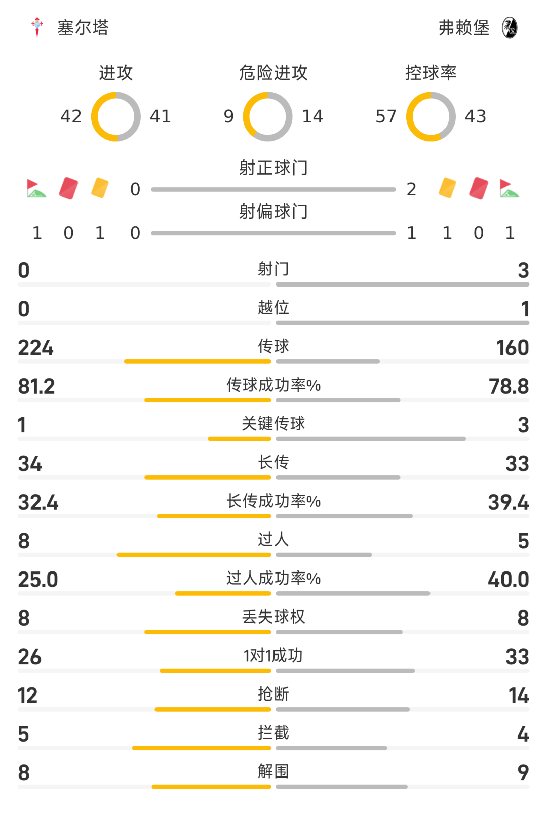 33’马塔诺维奇凌空抽射破门,VAR认定有效,塞尔塔0-1弗赖堡